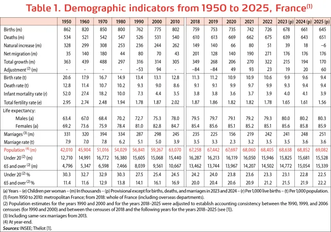 On 1 January 2026, the population of France was estimated at 69.1 million inhabitants, 66.8 million of whom live in metropolitan France and 2.3 million in the country’s overseas departments [1]. The population grew by 0.25% in 2025 (Table 1). Natural change, the difference between the numbers of births and deaths, was negative for the first time since the end of the Second World War. Over the past 10 years it has fallen from +205,000 (in 2015) to –6,000 (in 2025). Three-quarters of this decline is attributable to a reduction in the number of births (154,000 fewer) and the remaining quarter to an increase in deaths (57,000 more).